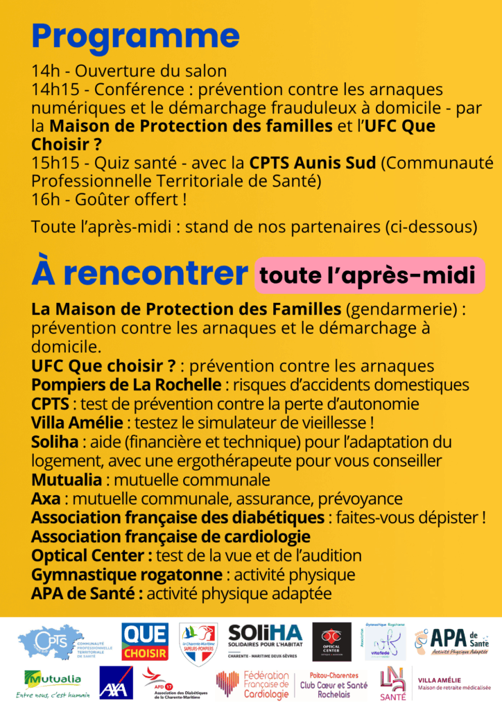 - 14h15 – Conférence : prévention contre les arnaques numériques et le démarchage frauduleux à domicile – par la Maison de Protection des familles et l’UFC Que Choisir ?